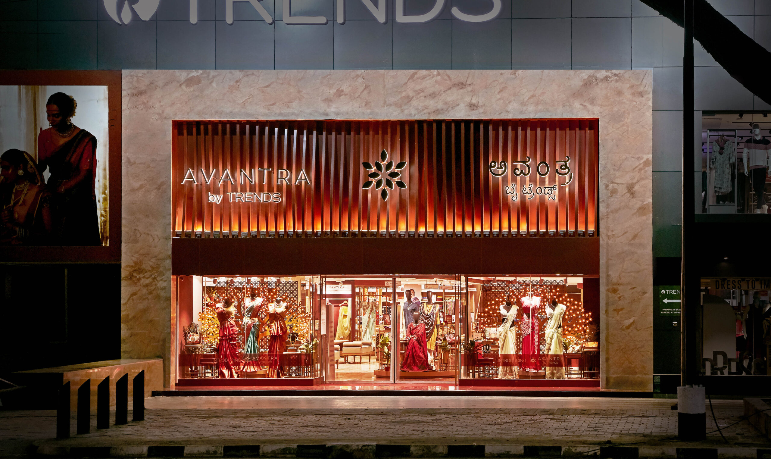 Our latest collaboration with Trends, is all about the beautiful saree. This historic and sensuous garment needed to be housed in an 8000sq ft space, equalling its grandeur. Introducing Avantra by Trends, a Trends foray into the saree market, was ideated keeping in mind the garment and what it stands for in our cultural context – a simple garment with endless possibilities, and the highest form of ornamentation.