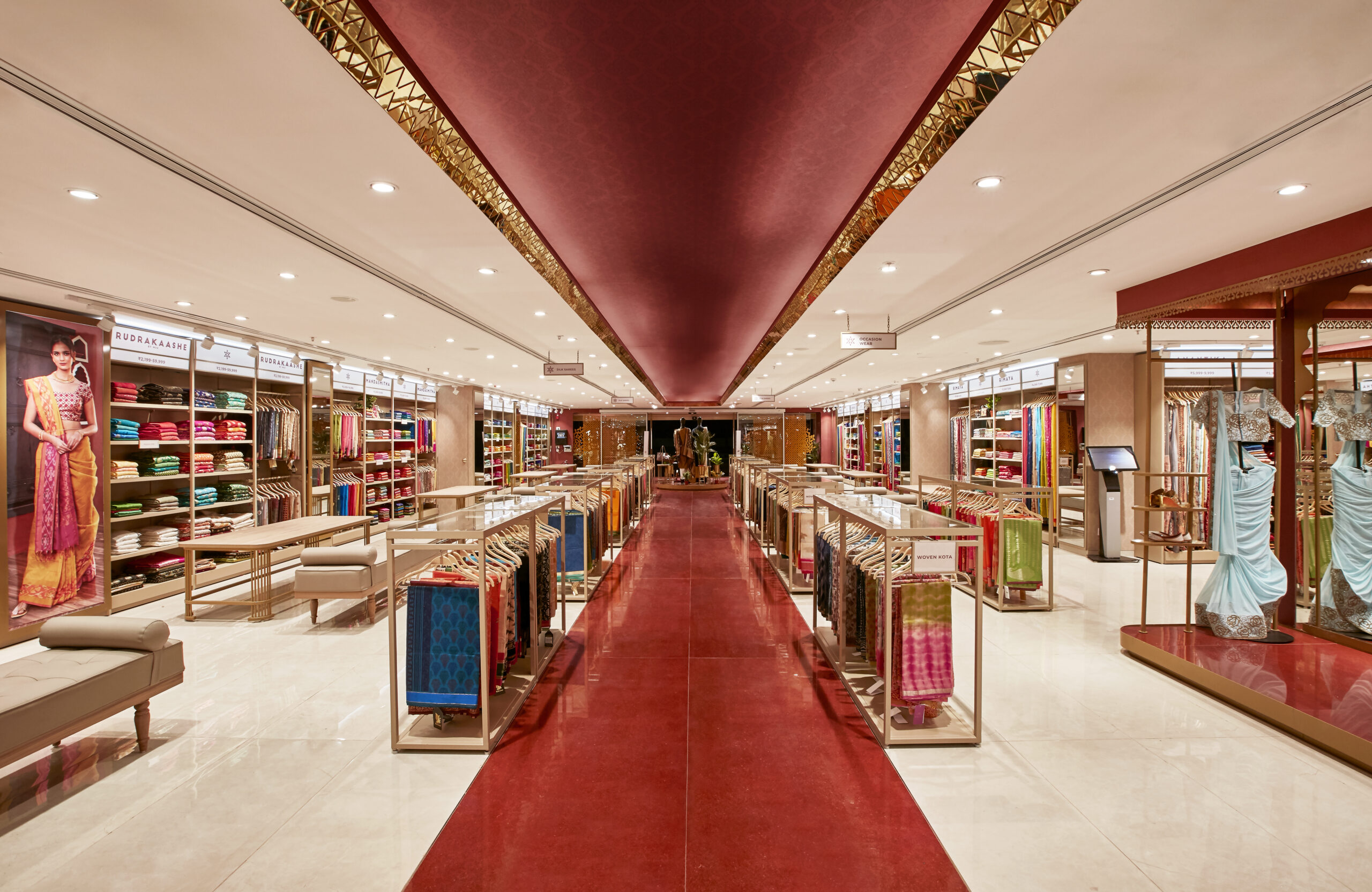 The central aisle leads the customer in, a red carpet welcome. Comfortable seating, easy way finding and personalised shopping spaces have been incorporated to allow shopped to browse and try out their favorite pieces with ease.