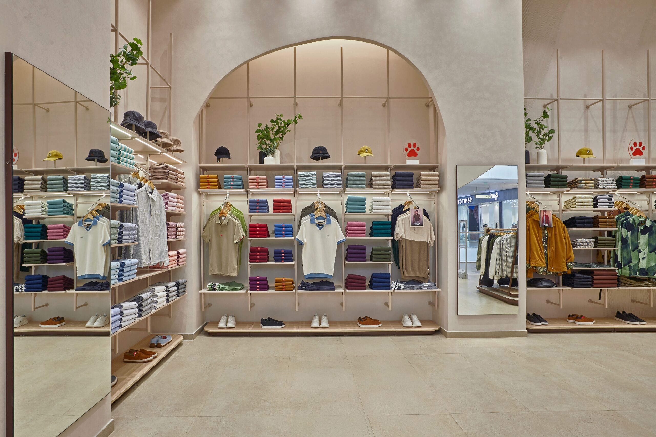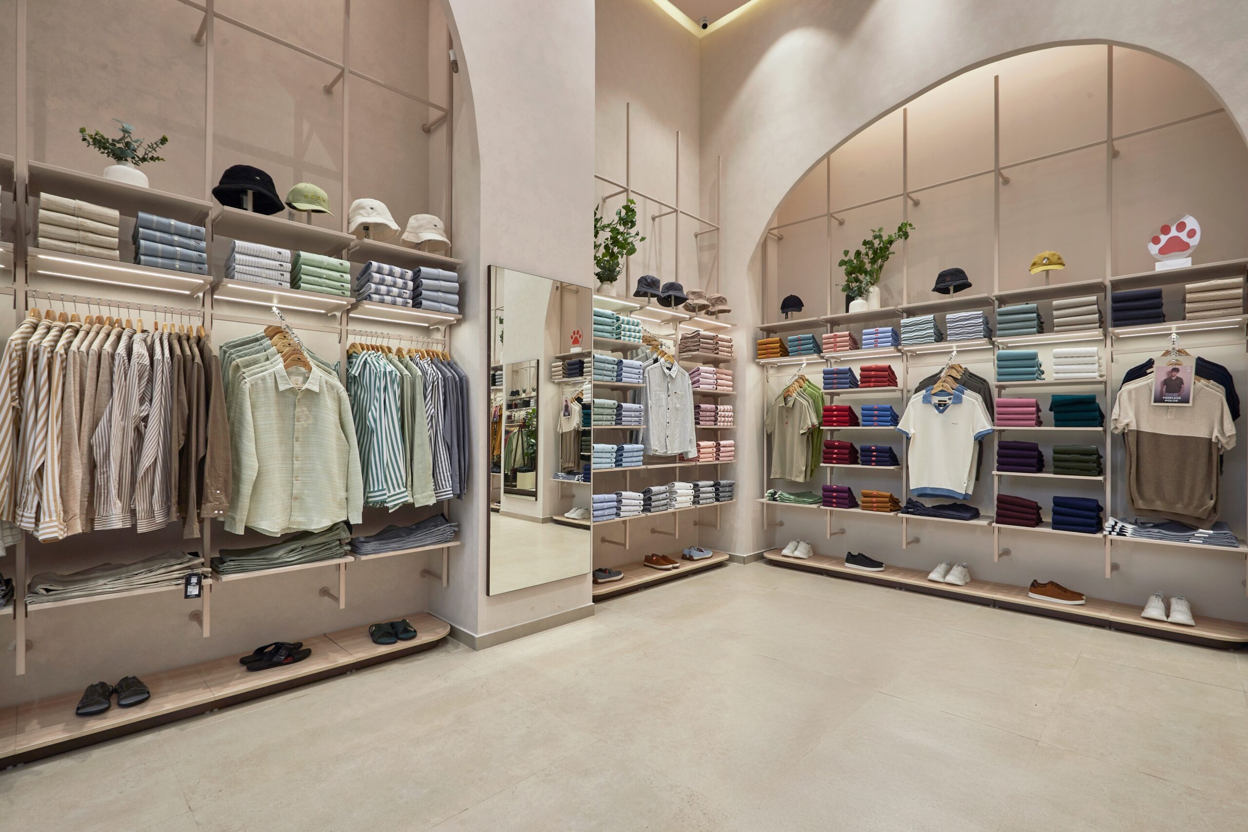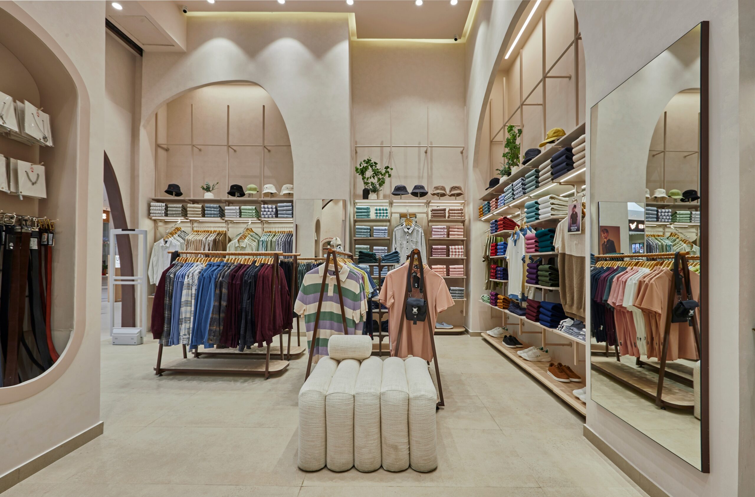 The mid-floor fixtures are concept-driven, designed as abstract frames with natural finishes, allowing flexibility in display arrangements. Wall-mounted fixtures maximize space while maintaining an open, breathable layout. Furniture and seating take on fluid, organic shapes, with statement poofs and benches that blend seamlessly into the environment. Mirrors are crafted in freeform silhouettes, complemented by hook shelves that add functional yet sculptural elements.