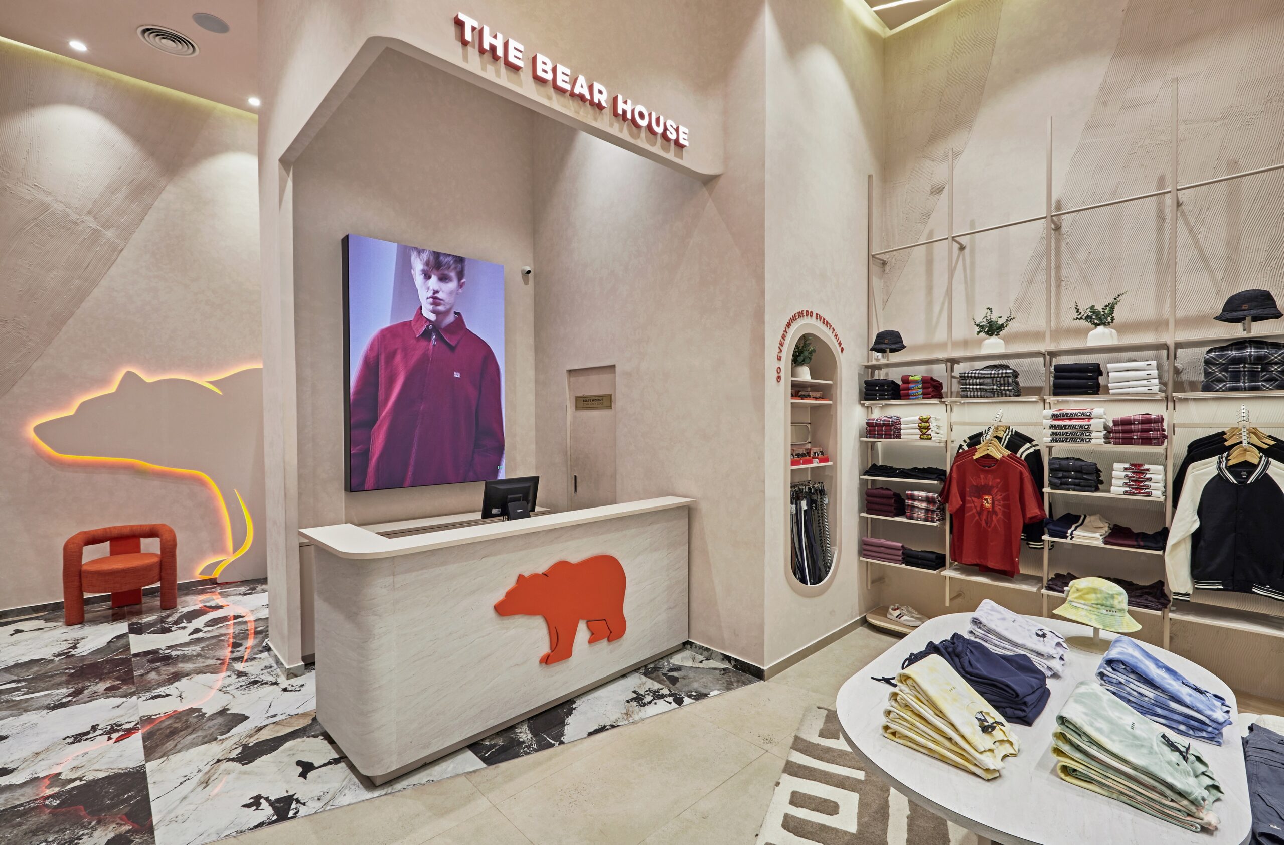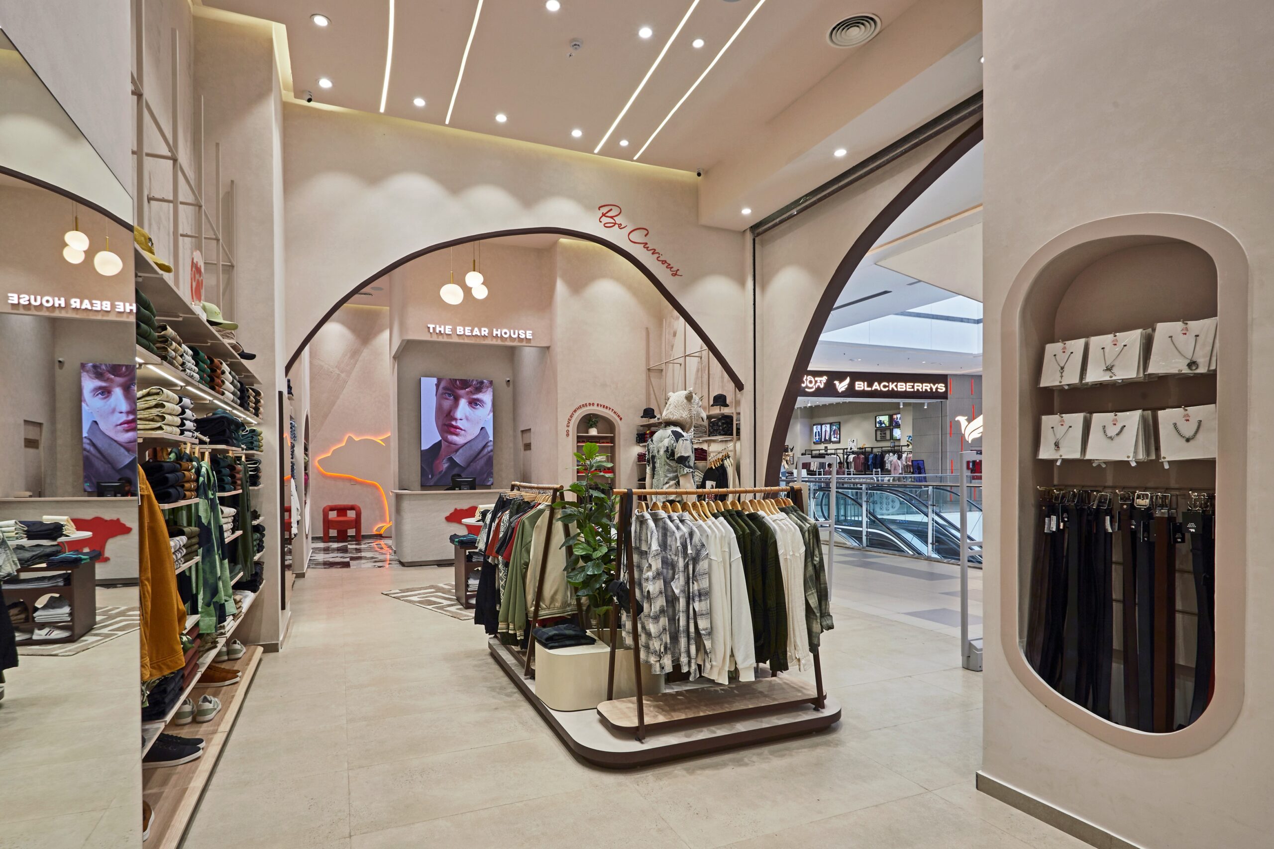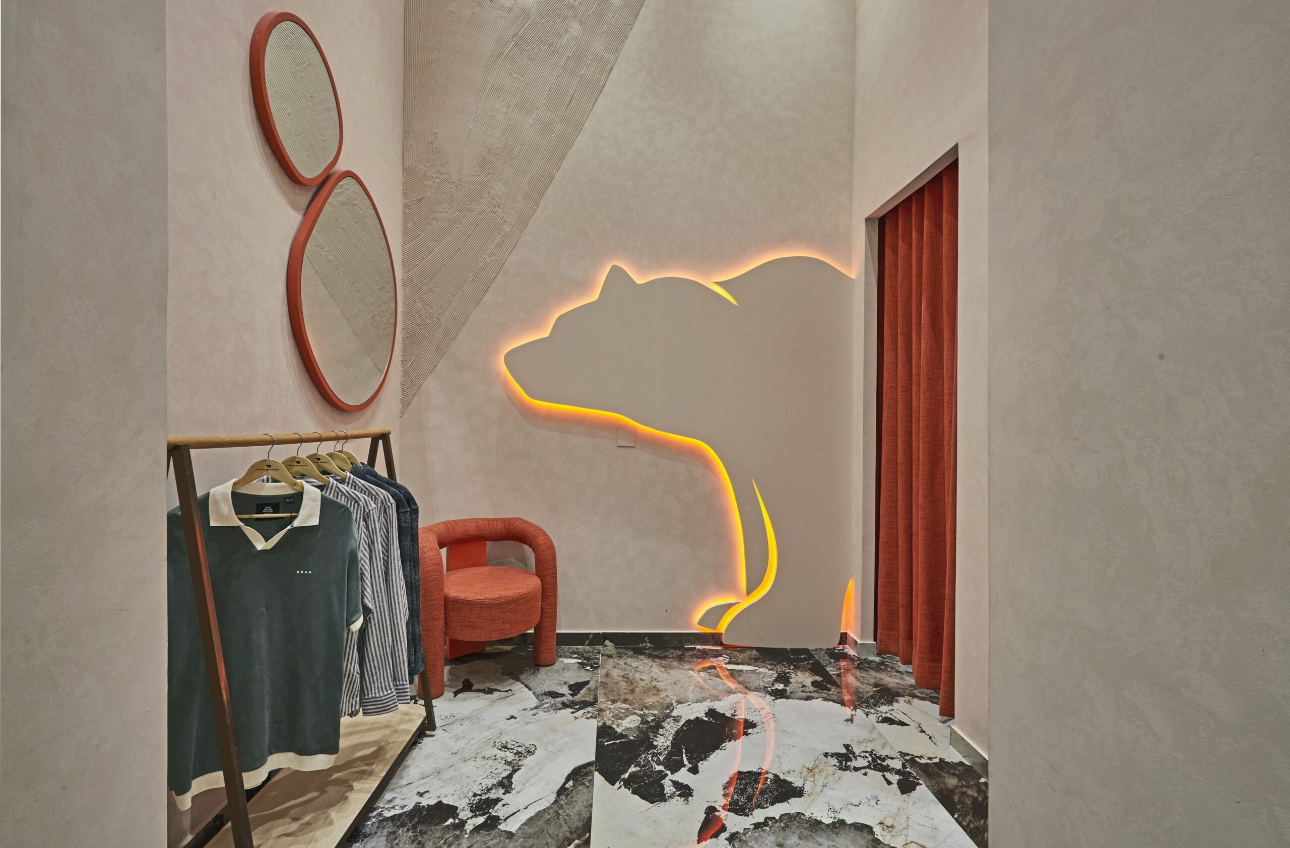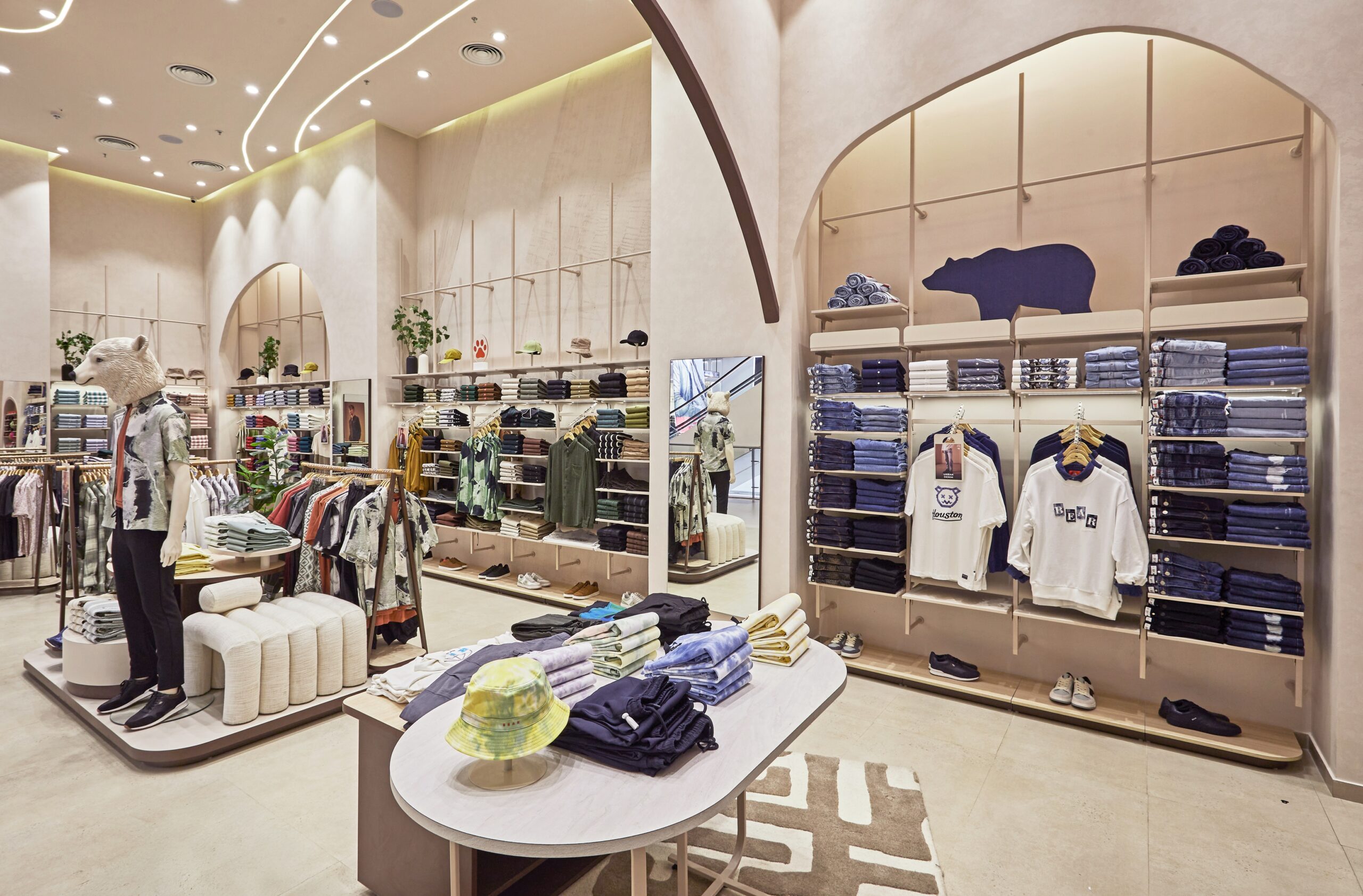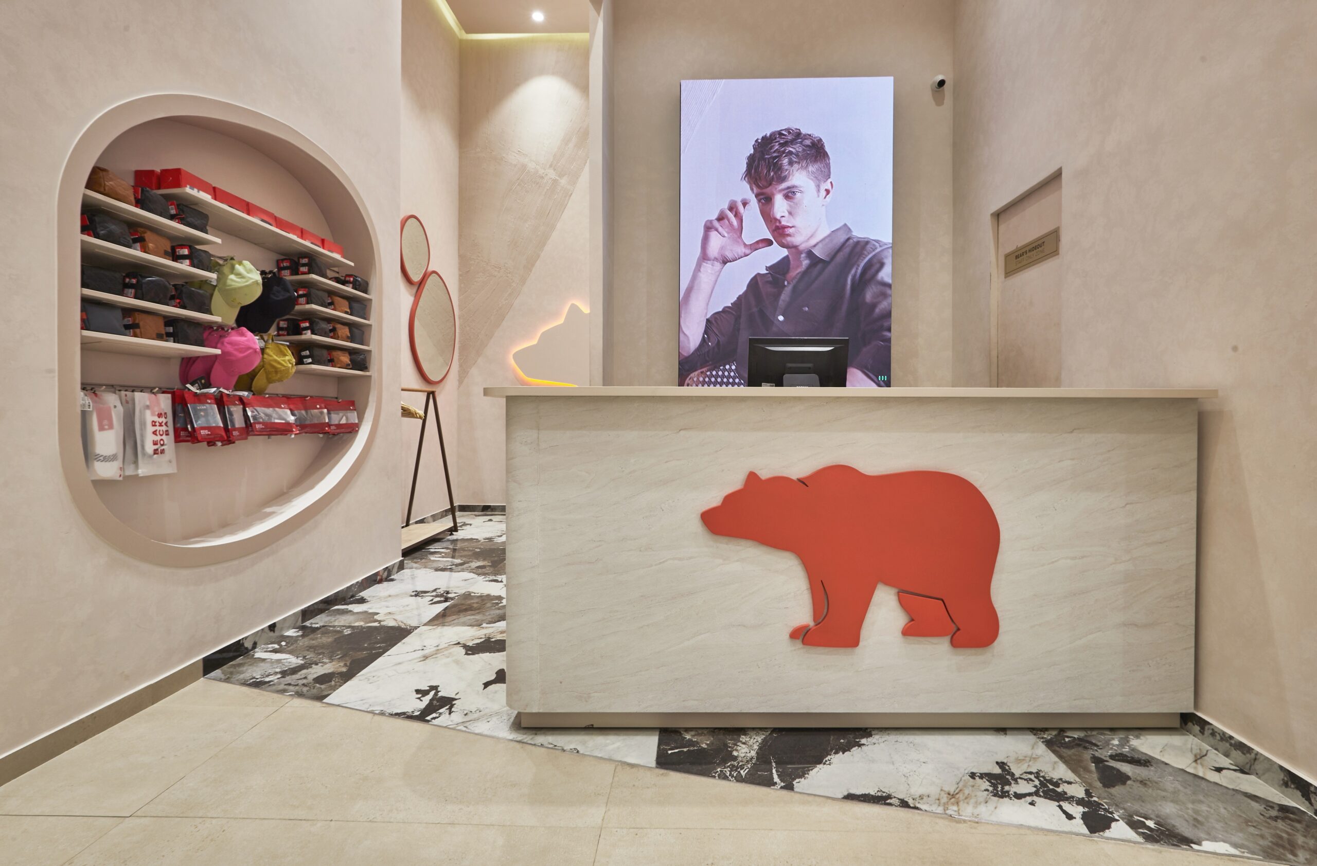 For The Bear House flagship store, Restore envisioned a space that reflects the brand’s raw yet elegant identity—an environment inspired by the essence of the bear’s natural habitat. The concept of the Bear Cave shapes the design, where organic forms, textured surfaces, and earthy tones come together to create an immersive retail experience. The architectural language is defined by sweeping arches and curved forms, abstracting the idea of a bear’s shelter. Elements like clawed-through walls, imprinted textures, and paw-marked details subtly reinforce the brand’s identity, while indirect lighting enhances the mood, mimicking the play of light in nature. The space is a refined yet rugged landscape that embodies the spirit of The Bear House.