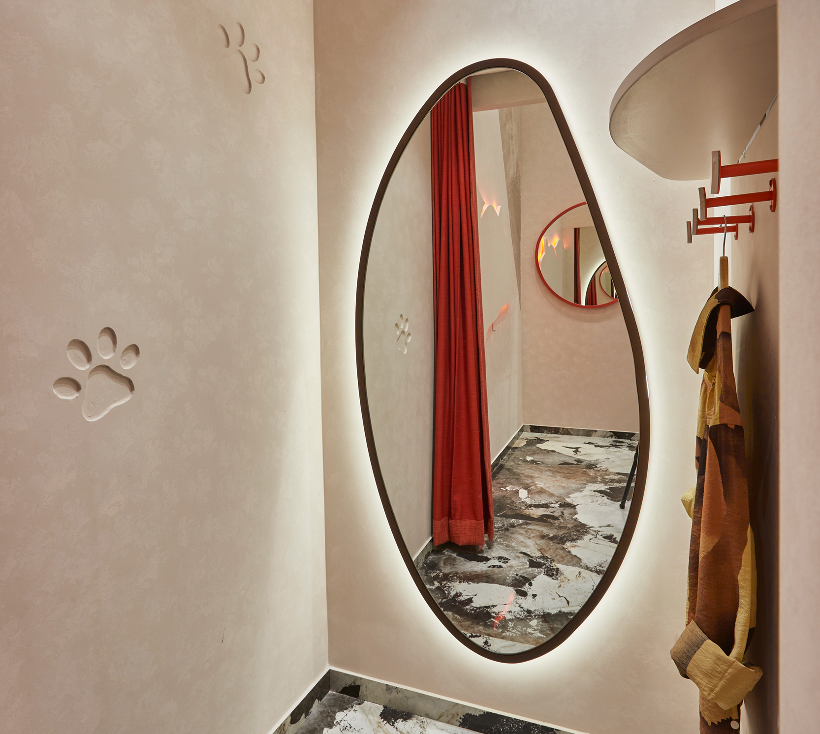 Lighting is deliberately concealed, with indirect illumination washing over corners and surfaces, creating a soft, ambient glow that highlights the textures and contours of the space. The brand’s signature red is used sparingly, appearing in select details to punctuate the space with subtle yet impactful accents. Debossed details such as pawprints further reinforce The Bear House’s identity, adding depth and tactility to the design. The result is a space that feels distinctly in tune with the brand—elevated, immersive, and unmistakably The Bear House.