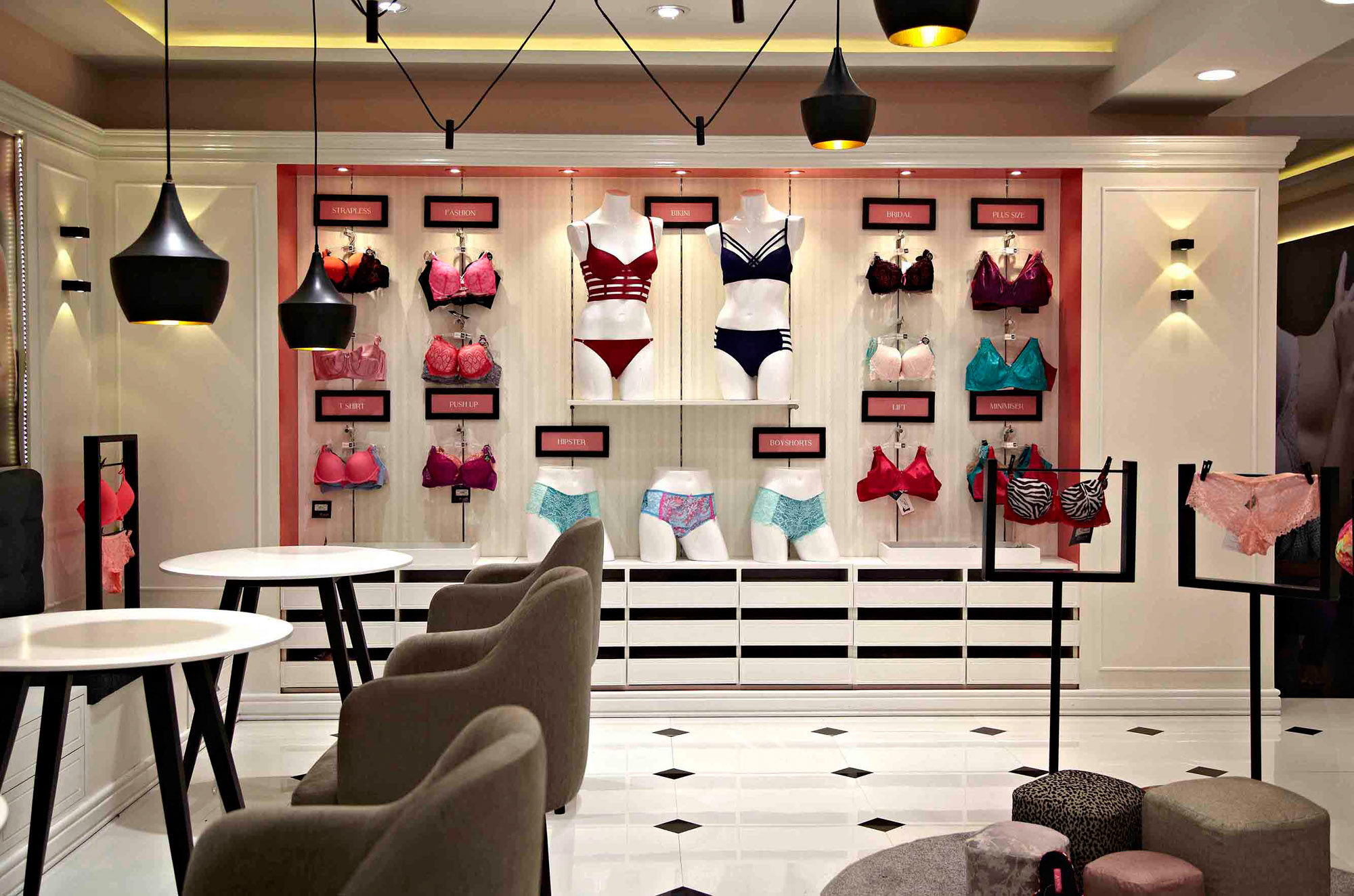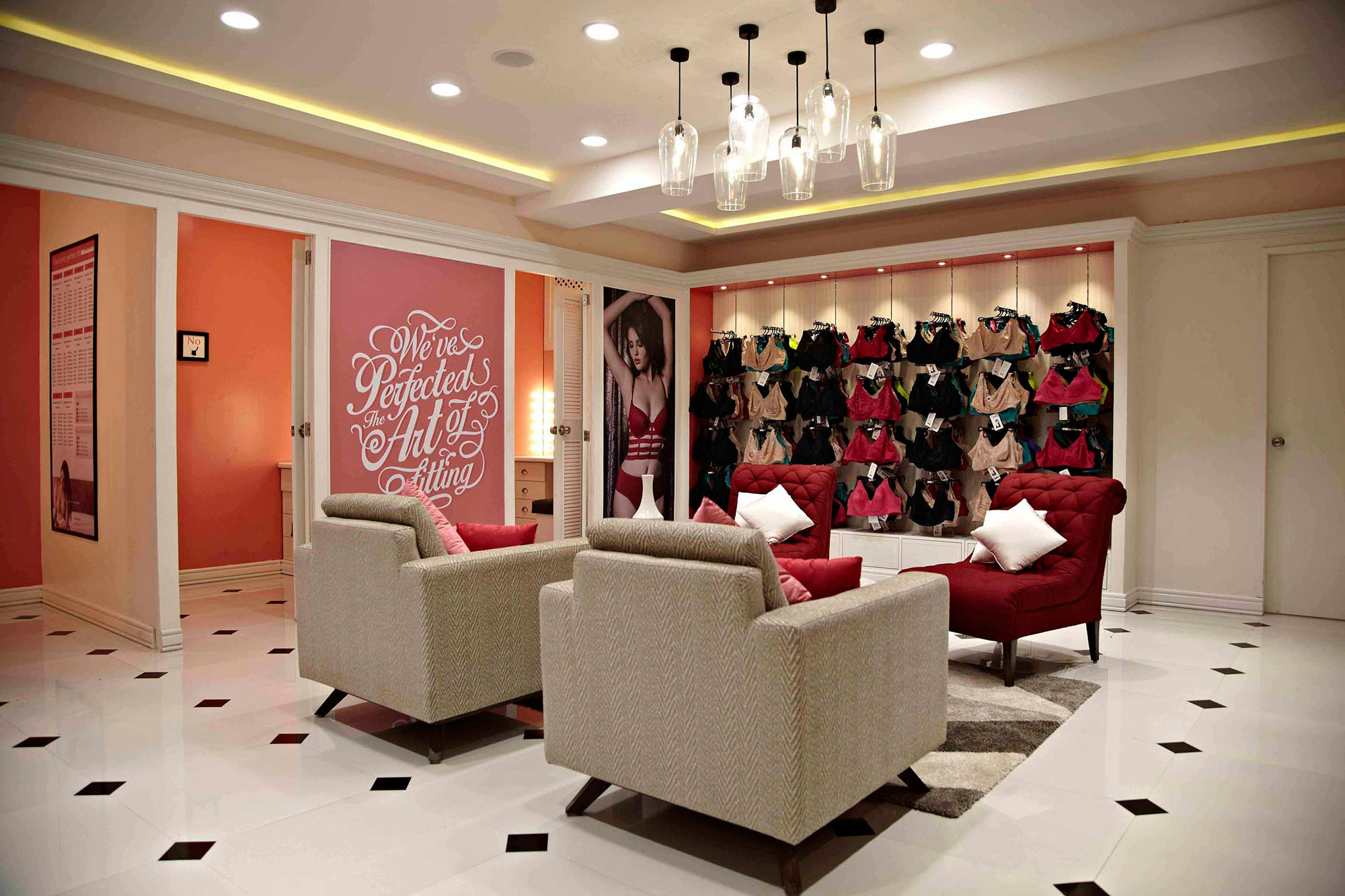 Dedicated to helping women find the perfect fit, the Fit Lounge features services of highly trained fit consultants. The consultants understand the customer’s needs, measure her and then offer a range of wonderful choices. For the Lounge, we chose a palette of muted grey and soft white. We then accented this palette with the brand colour. It is a perfect fit in more ways than one.